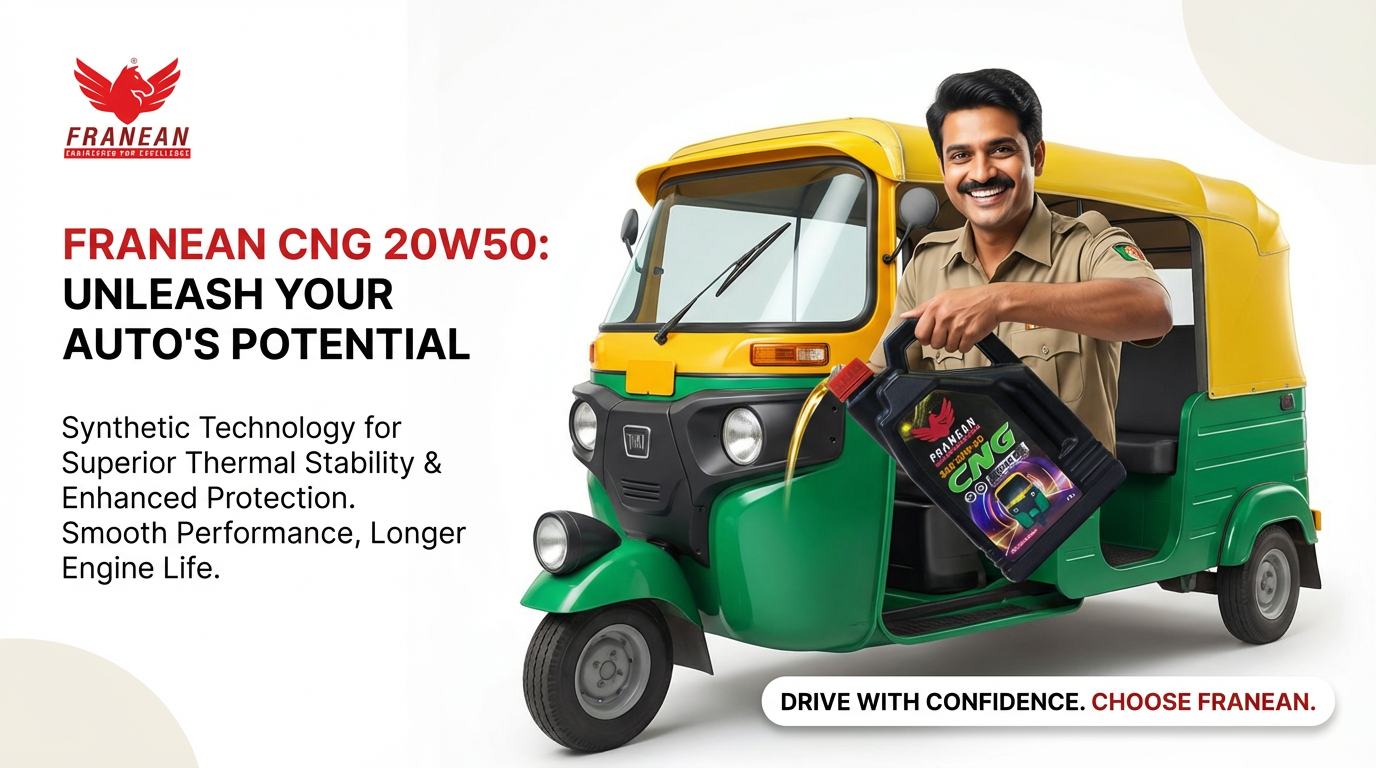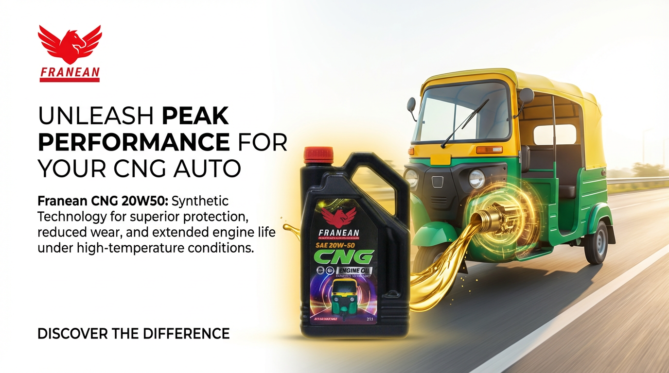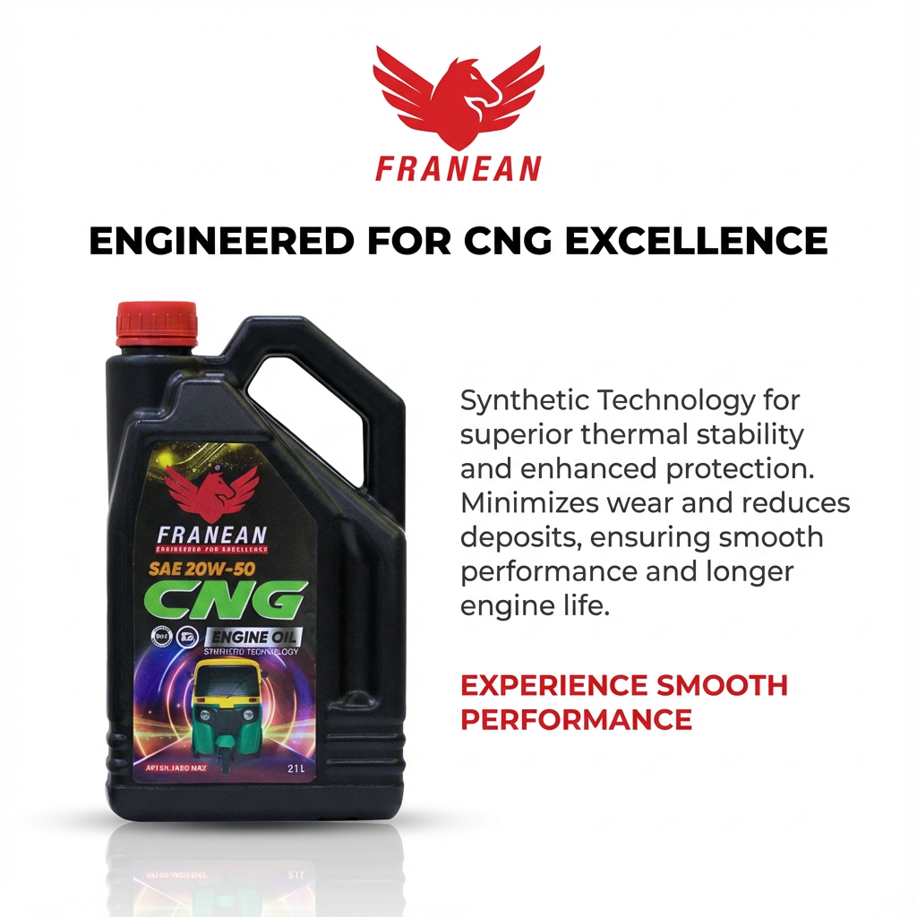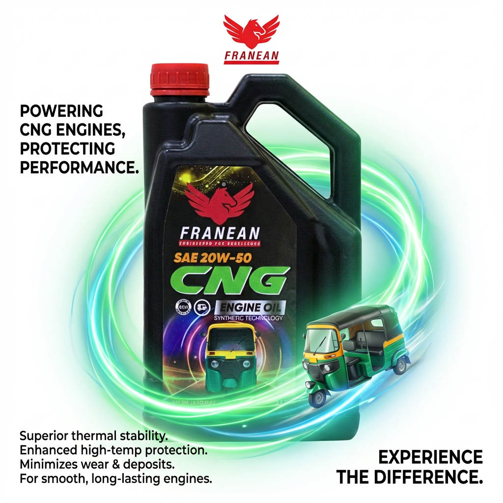 Franean 20W50 is a high-quality premium multigrade engine oil formulated to deliver strong protection, smooth performance, and long engine life along with extended drain interval and higher mileage IN CNG three-wheeler.