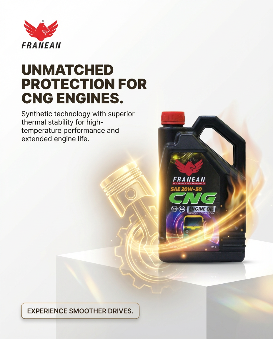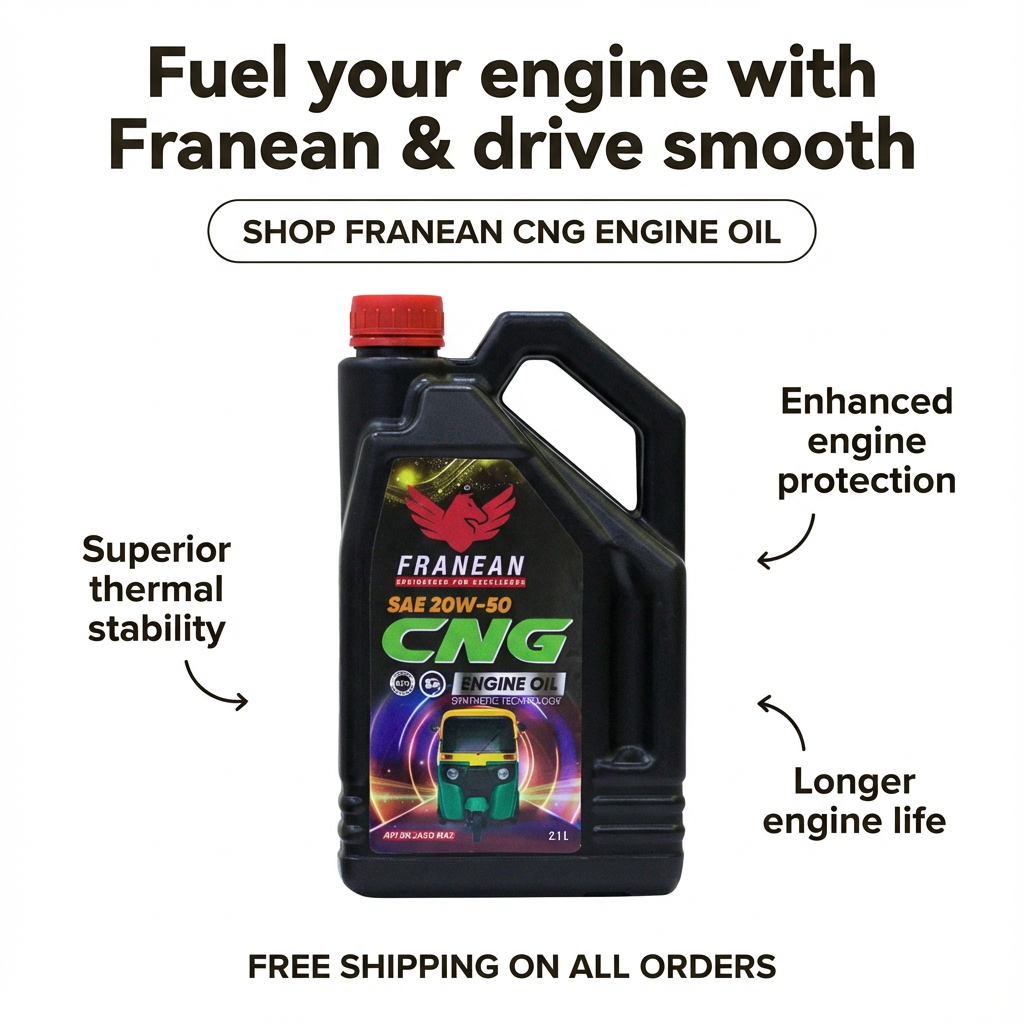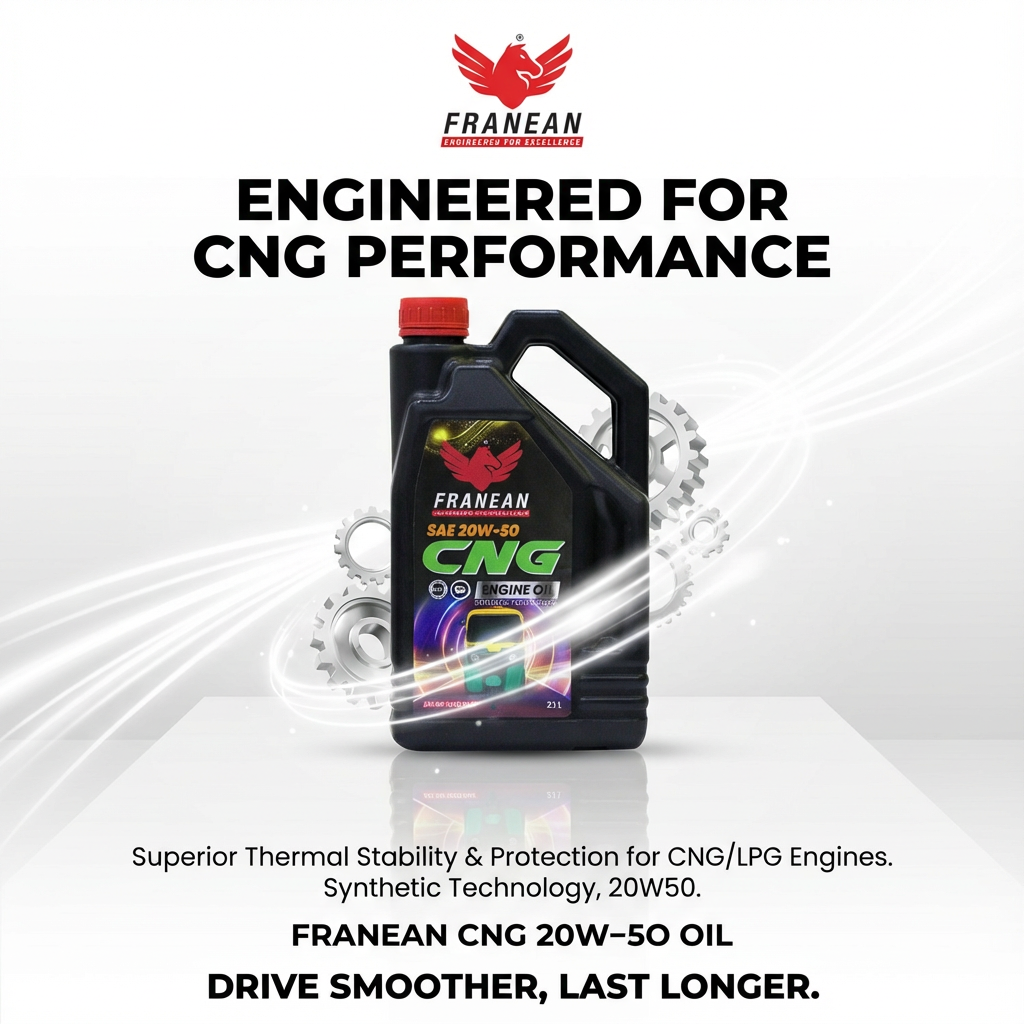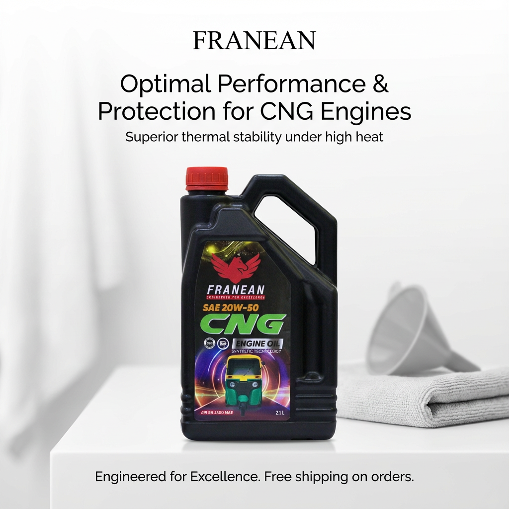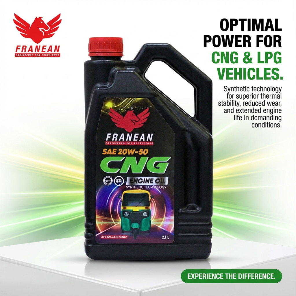 Franean CNG 20W50 Engine Oil is specially formulated for CNG and LPG-powered engines, offering superior thermal stability and enhanced protection under high operating temperatures. Its thicker viscosity provides strong lubrication, minimises wear, and reduces engine deposits, ensuring smooth performance and longer engine life in demanding CNG applications.